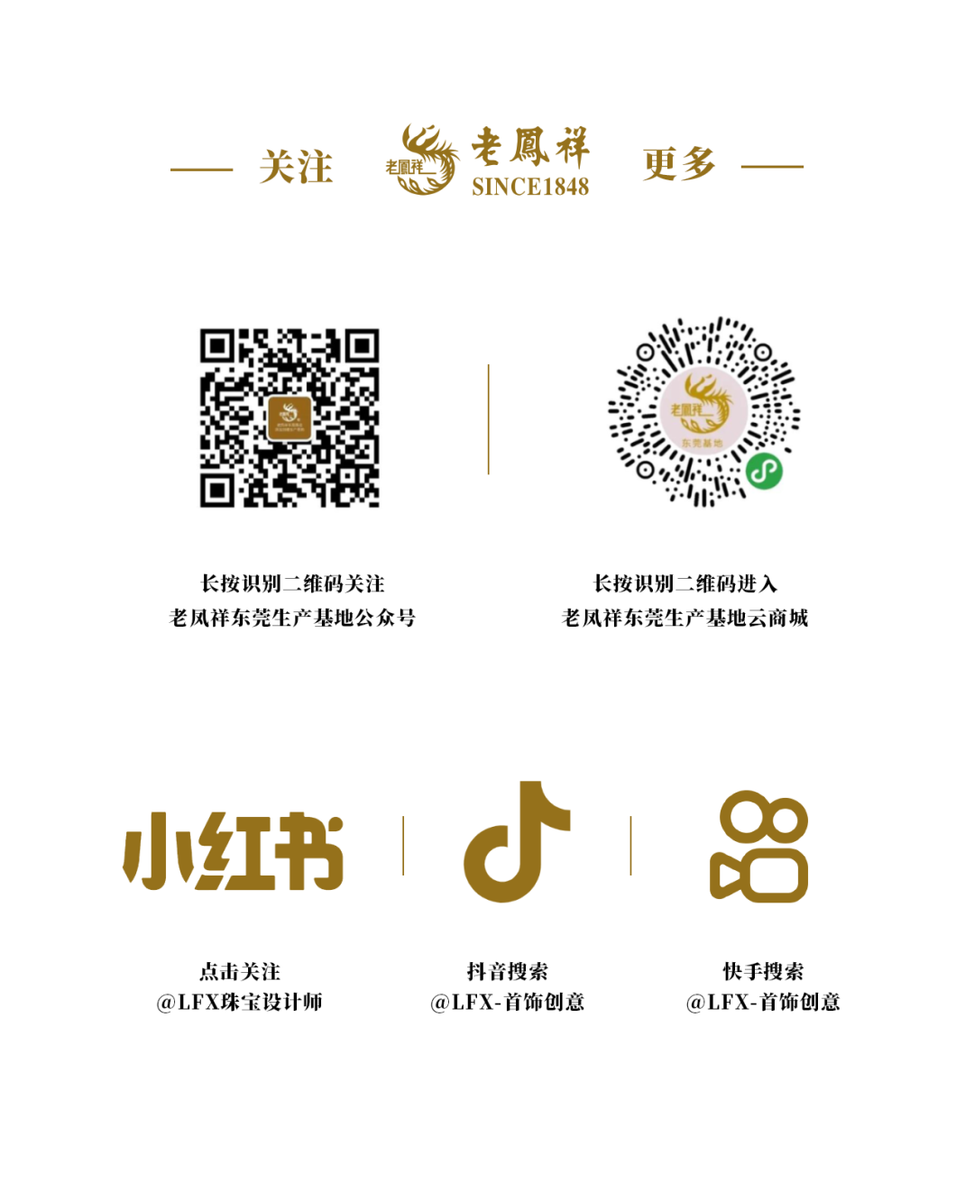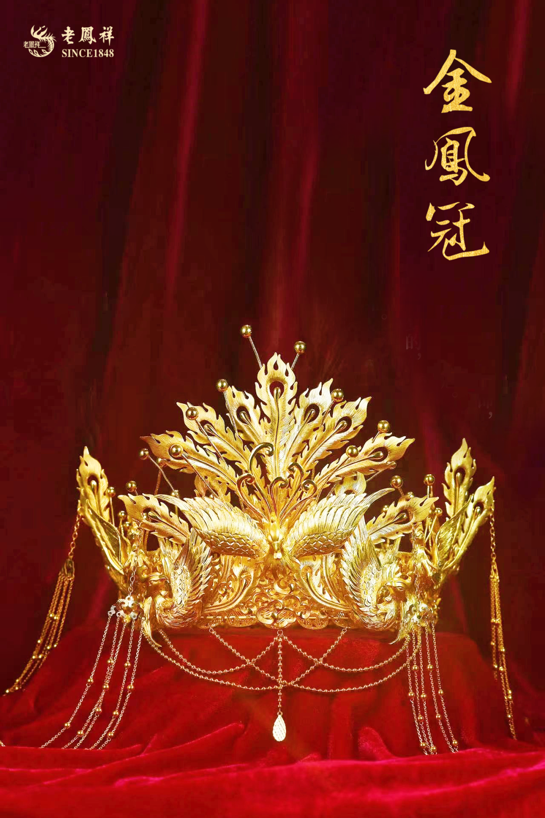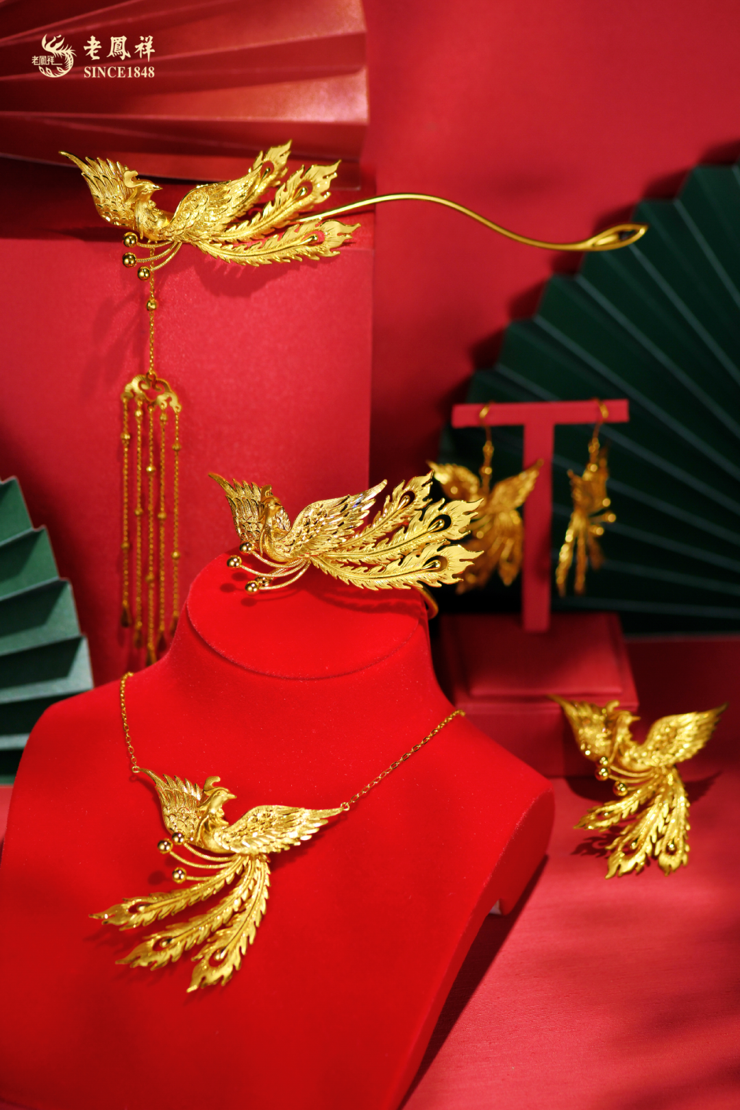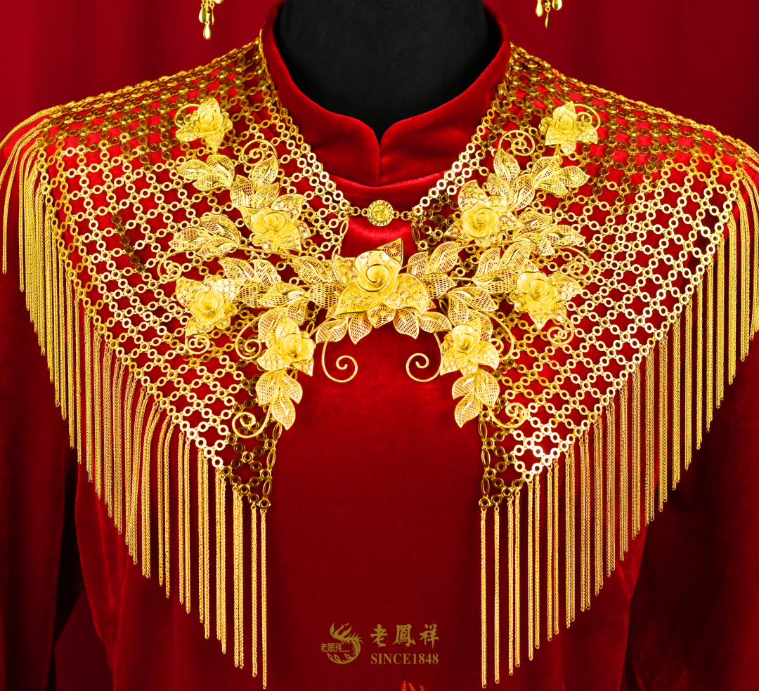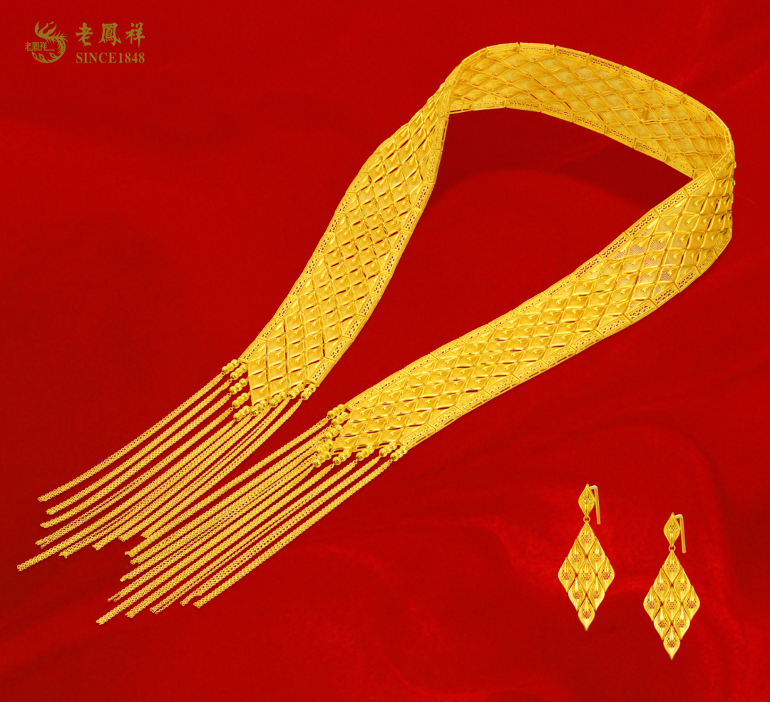 该系列产品齐全,包括金凤冠、金凤钗、金凤戒、手镯及耳坠等,在老凤祥东莞公司工艺大师炉火纯青的工艺加持下,犹如一只只振翅翱翔的凤凰傲于髻端、跃然指上、萦绕耳畔、嬉于颈间。凤羽皆采用手工批花和幻彩拉丝工艺,一丝一楼纤毫毕现,流光溢彩。凤头回眸顾盼生辉、神彩奕奕,凤尾修长飘逸、灵动大气,尽显母仪天下之风范,充分彰显出老凤祥作为百年品牌的传承与创新之美。( 项链 JF141075 约35g 、 凤戒 JF145065 约30g 、 凤钗 JF146032 约50g 手镯 JF142057 约45g 、 耳饰 JF144066 约26g )