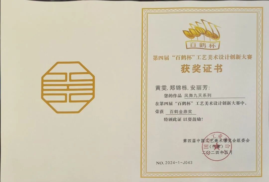 5月9日至12日, 第四届中国工艺美术博览会在福建福州举行,由上海老凤祥名师设计中心主任黄雯主导设计、老凤祥东莞公司匠心制作的国潮“凤舞九天”系列于博览会上惊艳亮相,并一举斩获第四届“百鹤杯工艺美术设计创新大赛”百鹤金鼎奖。