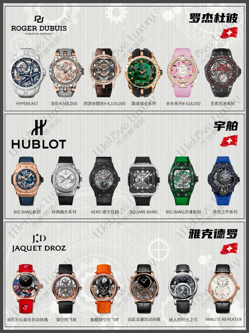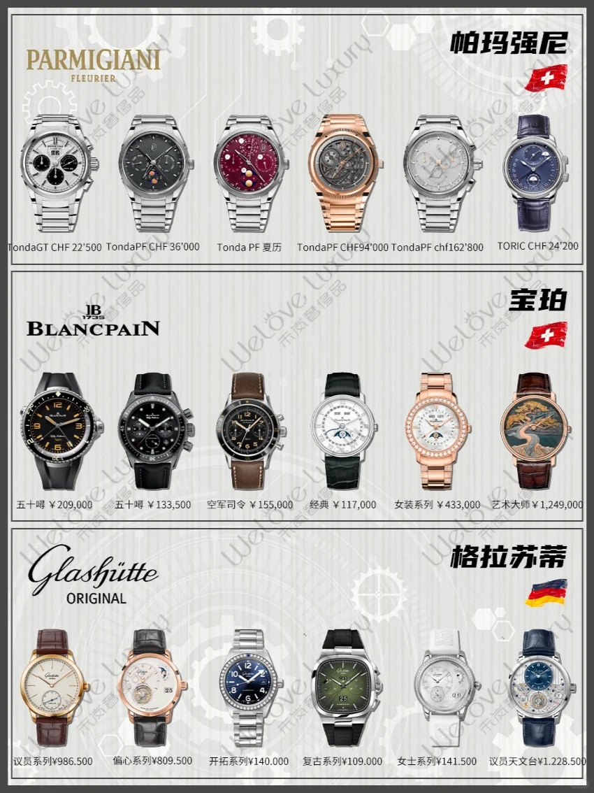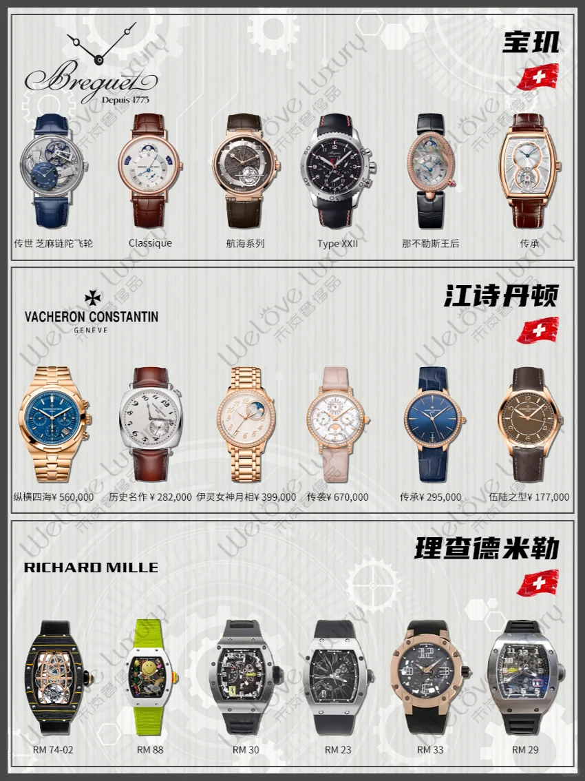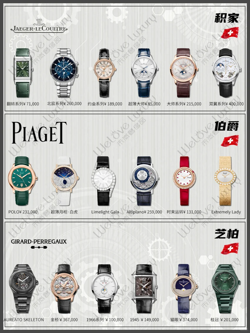 积家成立于1833年,是一家专注于高级制表的瑞士品牌。积家手表以精湛的工艺、复杂的功能和创新的技术著称,被誉为“高级制表的典范”。品牌旗下拥有Reverso、Master、Duomètre等多个系列,满足不同消费者的需求。