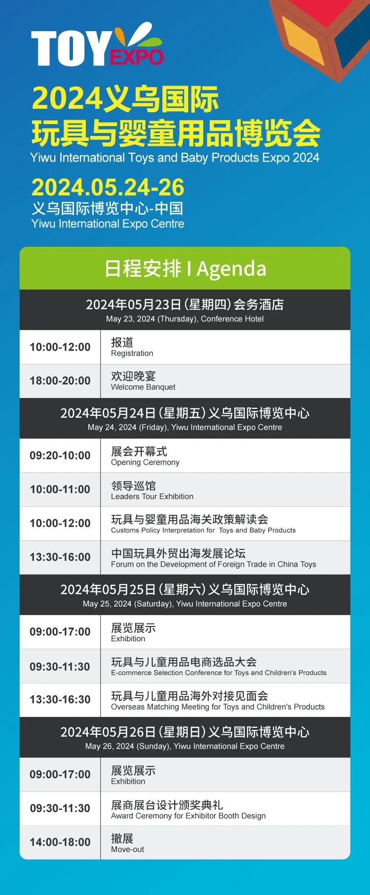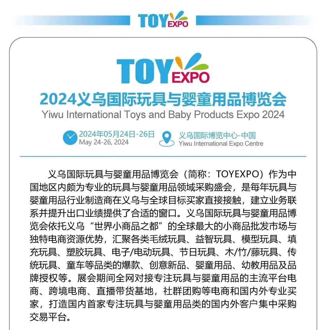 2024义乌玩具展即将开幕!为更好地帮助大家了解展会现场活动,今天我们为大家梳理了TOYEXPO 2024现场日程安排,方便大家快捷查询。