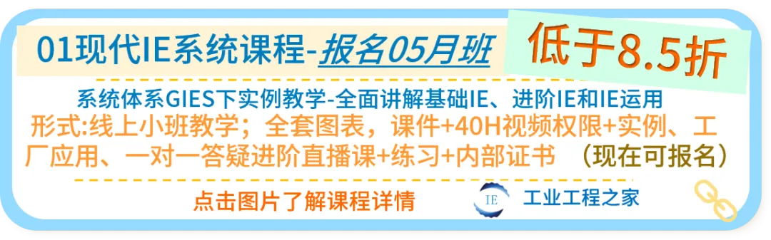 IE的系统体系、布局规划、标准工时、IE系列参数、线平衡、成本分析以及各种IE方法等在我们的现代IE系统课程-4/5月班级中都有系统和详细的案例讲解。现在可以报名,报名后即开通全套课件、图表、40H知识讲解视频权限等(新版本),还有16次进阶直播课(实例、应用、答疑等)。