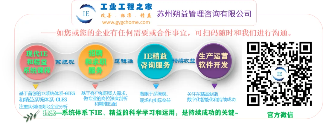 关注我们,享受系统、专业、体系化、重实用的IE精益知识讲解和岗位推荐剖析服务。关于IE、精益系统课程学习、企业IE精益培训、辅导以及其它咨询或合作,可随时联系我们~