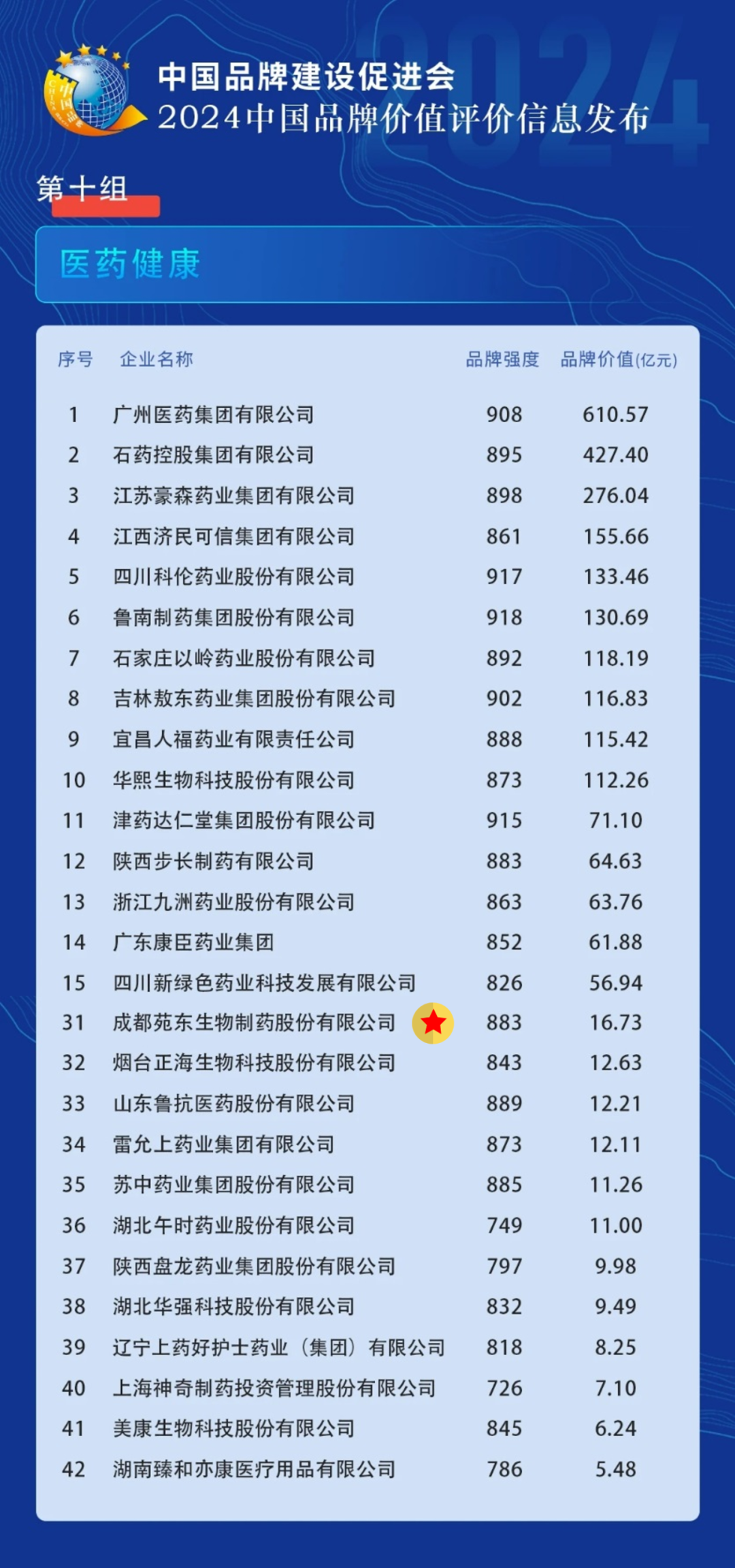 成都苑东生物制药股份有限公司在本次品牌价值评价中再次荣登“2024中国品牌价值评价”医药健康组榜单,品牌价值攀升至16.73亿元。自2021年参评以来,苑东生物已连续4年登榜,品牌价值连年增值,呈现出苑东生物品牌发展的勃勃生机。
