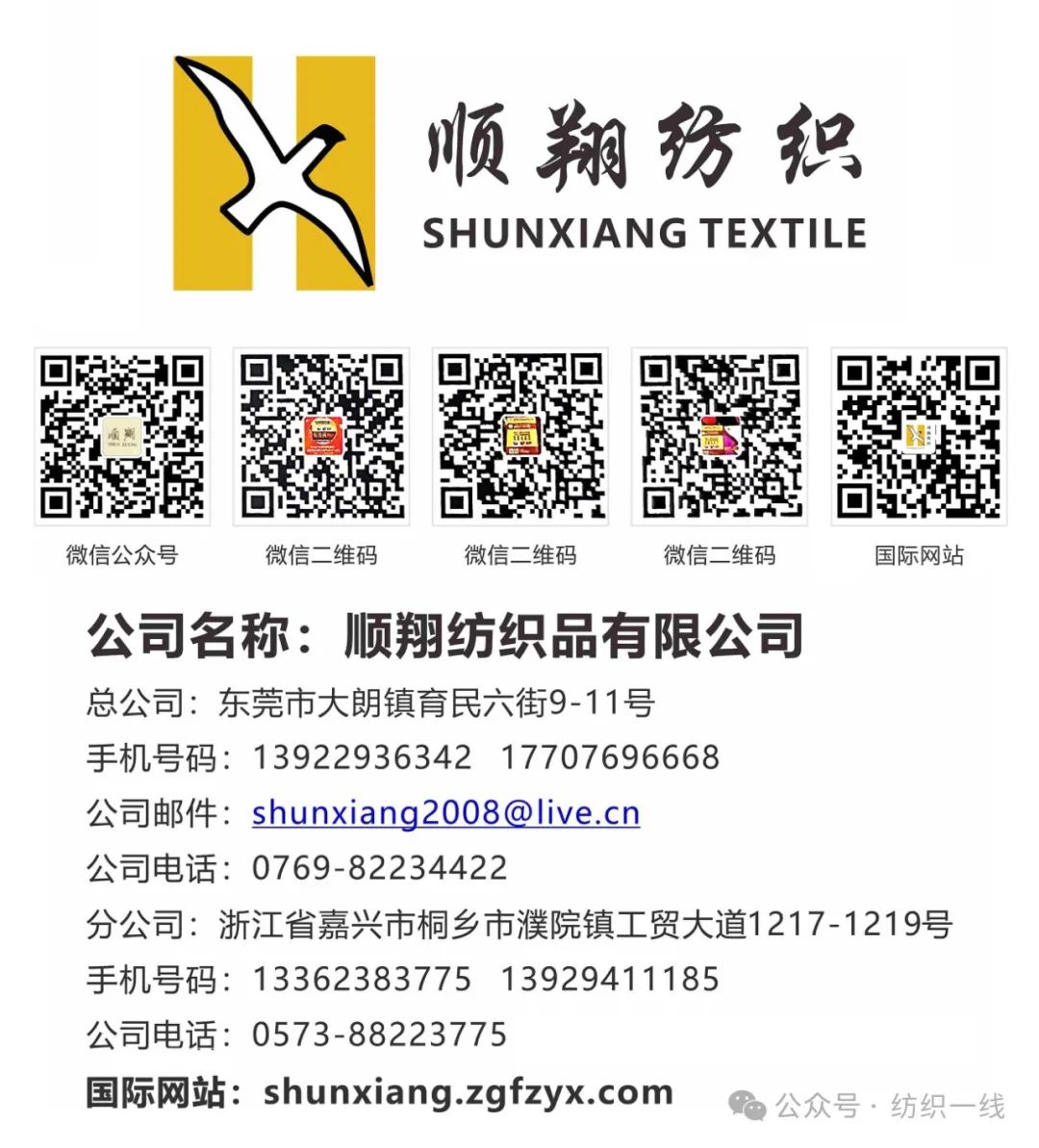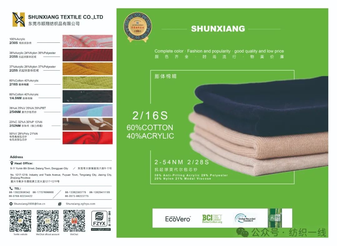 东莞市顺翔纺织有限公司,成立于2004年,总公司坐落于中国羊毛衫名镇/大朗镇育民六街9-11号,分公司浙江省桐乡濮院工贸大道1217-1219号.顺翔纺织投资研发有纺厂.染厂,摇纱 打毛厂,拼纱厂,是一集研发,生产,染整,产业链仓储式销售于一体的毛织纱线制造商。我们以优良的品质,服务,信誉为理念,服务于国内外中高端服装毛衫品牌.