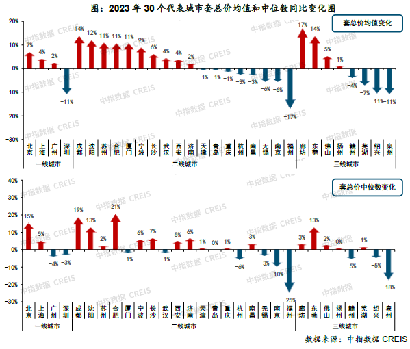 据中指数据,改善性住房需求仍为新房市场关键支撑,代表城市中多数城市套总价均值、中位数和各价位门槛值均高于上年同期。其中14城套总价均值、中位数同比均上涨,北京、合肥、成都、东莞等城市涨幅较为突出。同时,多个重点城市中高总价段成交套数同比增长、占比提升,北京、上海、成都、长沙等城市中高总价段成交占比提升态势延续,其中北京500-1000万总价段成交套数同比增长26.2%,占比提升8.4个百分点。