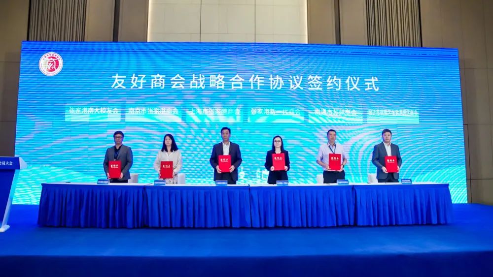 上海市张家港商会一届四年的发展, 离不开友好商会的支持和帮扶。大会上,张家港市新一代企业商会、南通市苏州商会、南京市张家港商会、宿迁市宿豫区张家港园区商会、南京大学张家港校友会、上海市张家港商会联合签署了友好商会战略合作协议,为上海、张家港、南京、宿迁市几方面的企业家资源共享和商界合作搭建了更为坚实的桥梁。