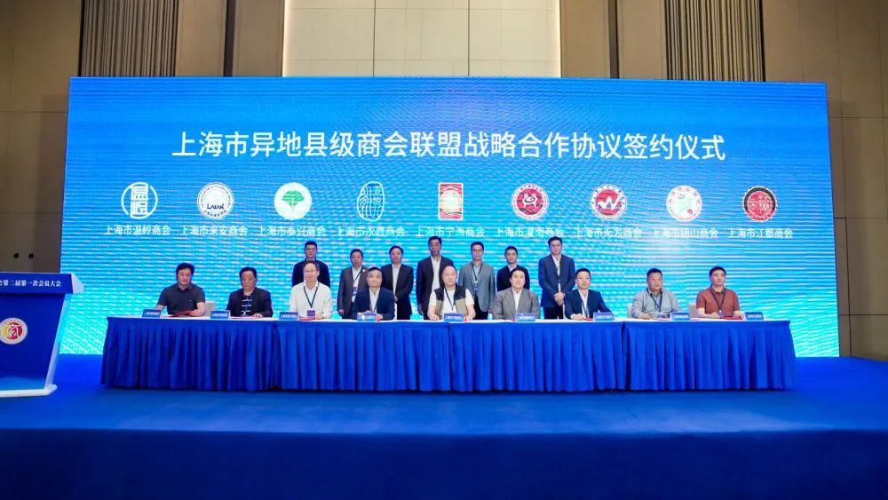 此次会议更是上海市异地县级商会联盟的盛会,自2023年11月11日, 上海市异地县级商会联盟第一批十一家商会(上海市张家港商会、上海市启东商会、上海市高邮商会、上海市长兴商会、上海市嘉善商会、上海市仪征商会、上海市安徽濉溪商会、上海市界首商会、上海市泗洪商会、上海市余杭临平商会、上海市丹阳商会)共同签署战略合作盟约, 资源共享,融合发展。时隔半年,第二批九家上海市县级商会(上海市泰兴商会、上海市灌南商会、上海市无为商会、上海市来安商会、上海市江都商会、上海市宁海商会、上海市永嘉商会、上海市砀山商会、上海市温岭商会)再次签约加入联盟,为联盟注入了新鲜血液。来自二十家县级商会会长、秘书长长齐聚一堂,共同参与和见证上海市异地县级商会联盟的签约仪式和会旗传递仪式,气氛热烈。