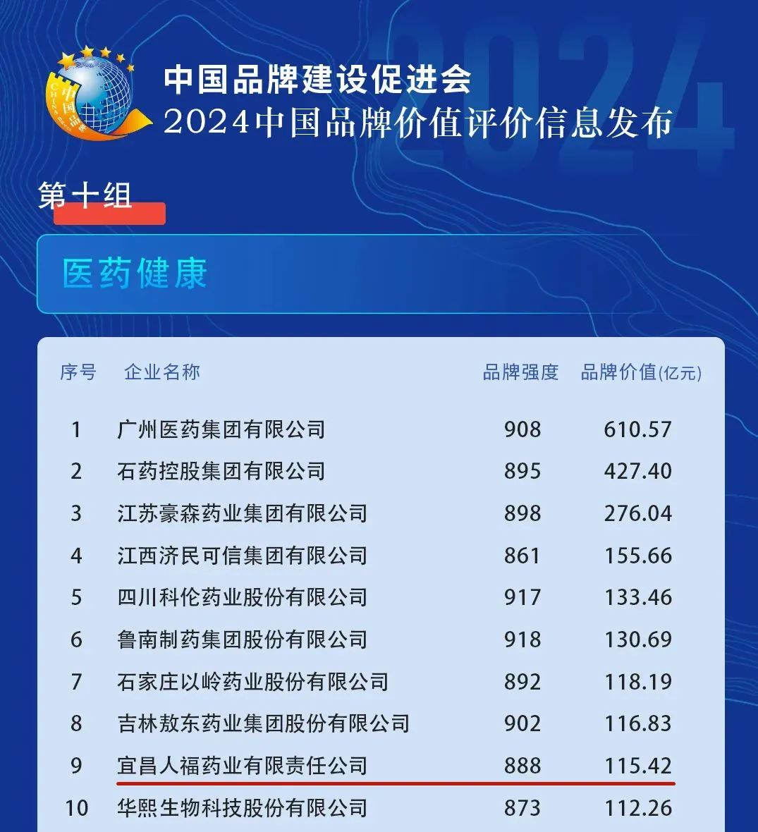 近日,新华社、中国品牌建设促进会、中国资产评估协会等单位联合发布“2024中国品牌价值评价信息”,宜昌人福药业位居医药健康组前列,排名第九,品牌价值为115.42亿元,较上一年度提升超20%。
