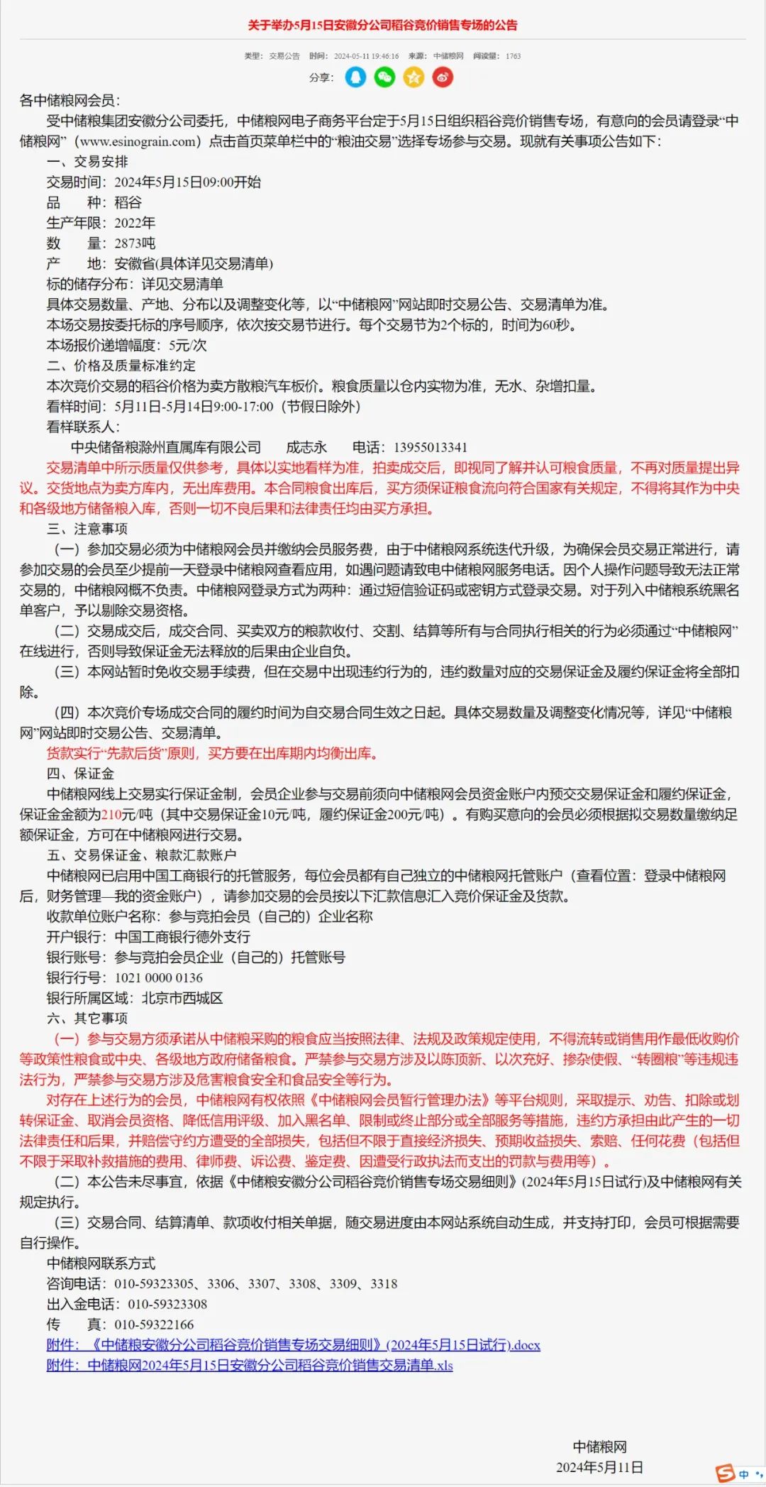 关于举办5月15日安徽分公司稻谷竞价销售专场的公告