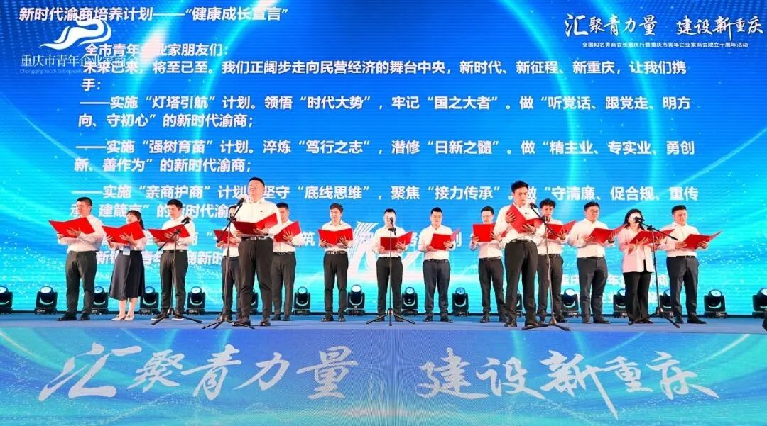 重庆市青年企业家商会、重庆市企业合规促进会共同发起新时代渝商培养计划——“健康成长”宣言。尹顺新、郑华友、蒋宇、黄义奎、刘一、韩路阳、张艺蓬、李奇、张宬铭、唐昆尧、黄星顺、胡凌云、叶薇薇、彭松、许图作为青年渝商代表倡议全市青商“一盘棋”,共筑“同心圆”,努力开创“十名领军、百名精英、千名骨干、万名新锐”青年渝商新时代。