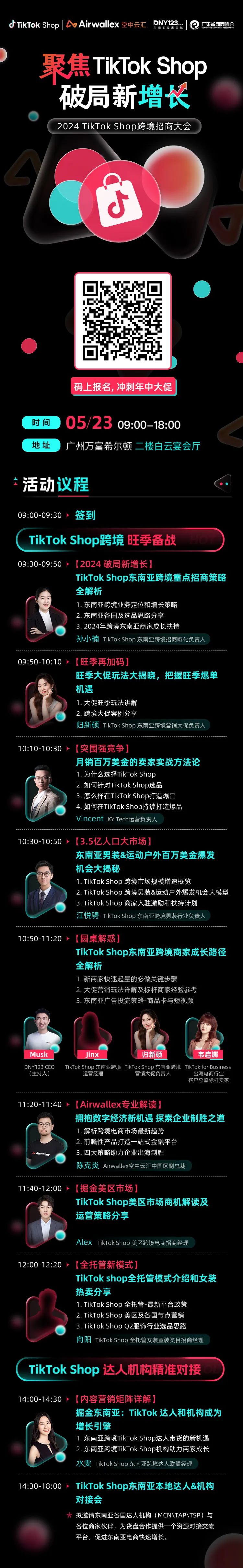 5月23日即将举行的“【聚焦TikTok Shop 破局新增长】2024 TikTok Shop跨境招商大会——广州站”将进一步为商家剖析其在当前电商环境中的投放价值,为商家备战6.6大促提供实战指导。