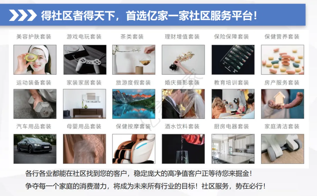 通过小区群+社区活动+社区商城+媒体矩阵等全方位线上线下双向O2O运营,现已链接全国10000+社区群,凭借资源优势将政府、物业、商家紧密联合,打造社区生态服务平台。
