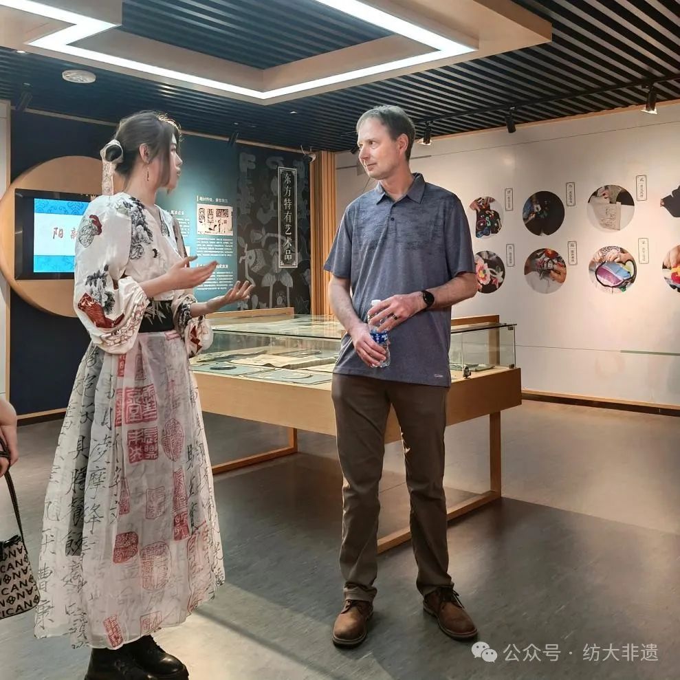 5月7日美国爱达荷州立大学英语与哲学系主任Prof. Brent Wolte来武汉纺织大学荆楚纺织非遗馆参观。
