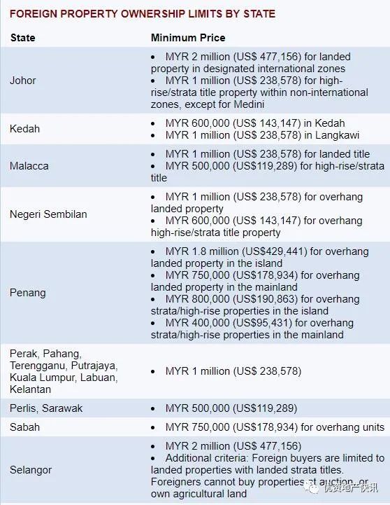 在吉隆坡,以及霹雳州、吉兰丹、布地拉贾亚、纳闽、潘昂和丁加奴,最低投资要求是100万马来币(238,578美元),而在佩利斯和沙捞越只需50万马来币(119,289美元)。其他州也有不同的外国财产所有权限制,如下表所示。