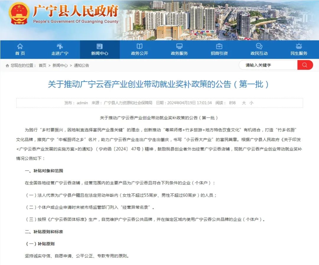 为擦亮广宁“中餐厨师之乡”名片,助力广宁云吞产业走出广宁走出肇庆,书写“小云吞大产业”的富民篇章。我县现已向社会发布《关于推动广宁云吞产业创业带动就业奖补政策的公告(第一批)》。具体细则如下: