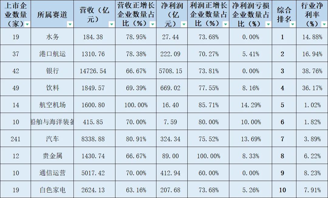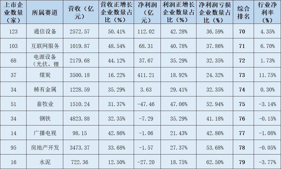 备注:以上统计数据来源于东方财富网,综合排名计算规则:综合排名=营收正增长企业数量占比*30%+净利润正增长企业占比*30%+行业亏损企业数量占比*40%