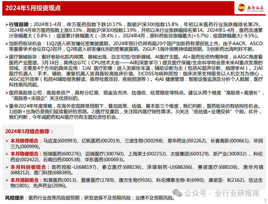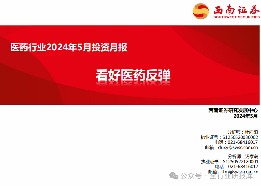 本片分享的是【医药行业2024年5月投资月报:看好医药反弹】 报告出品方:西南证券