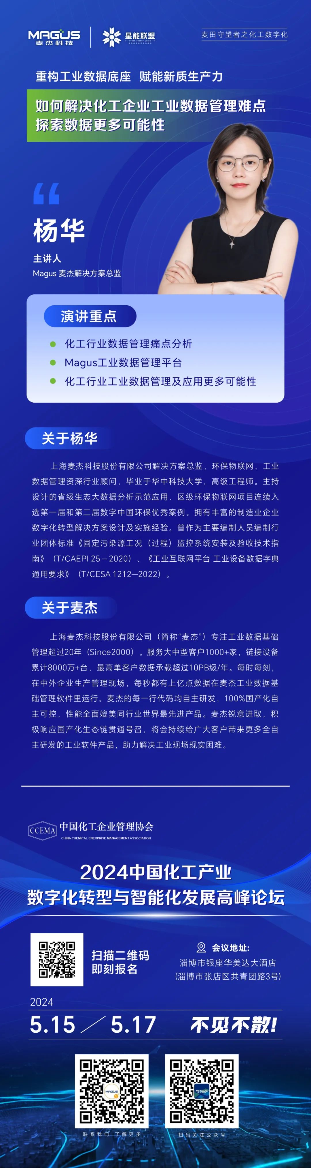 2024年5月15-17日,山东淄博,2024中国化工产业数字化转型与智能化发展高峰论坛,麦杰解决方案总监杨华女士将与化工行业合作伙伴及用户分享近年来麦杰在化工行业工业数据采集、存储及管理领域支撑化工企业生产运营等数字化转型领域的探索及思考 ,敬请关注!