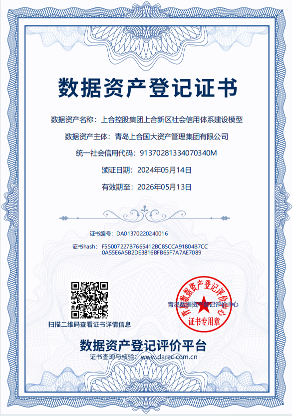 上合控股集团数据资产入表取得重大突破——首单数据资产成功入表。5月14日,集团在青岛数据资产登记评价中心支持下,完成了“上合控股集团上合新区社会信用体系建设模型”数据资产入表。此次入表是上合新区首单,是一项具有里程碑意义的成绩,充分彰显了集团在数据资产管理和应用方面的能力,也为上合新区推动数字经济发展注入了强大动力。