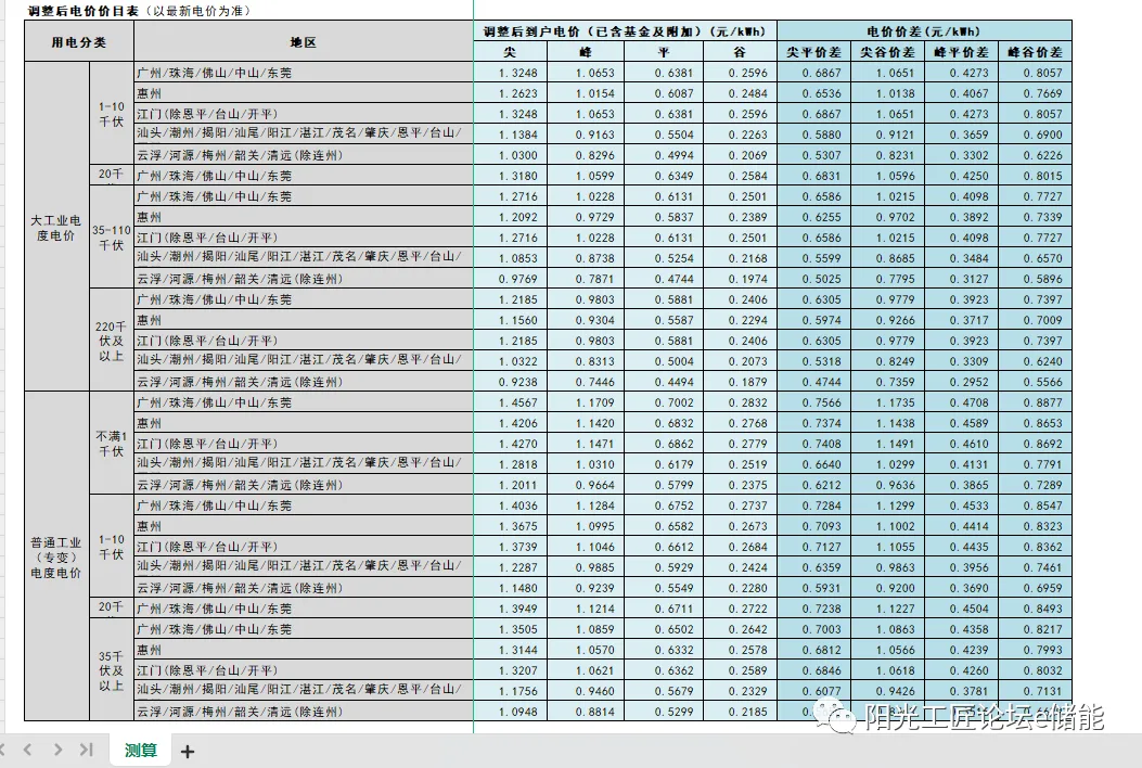 调整后电价价目表
