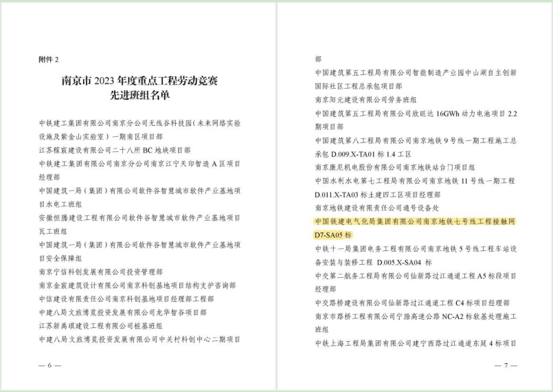 近日,南京市总工会印发了《关于南京市2023年度重点工程劳动竞赛结果的通报》,62个集体被评为“南京市2023年度重点工程劳动竞赛先进班组”,其中城轨公司承建的南京地铁七号线工程接触网D7-SA05标获评为“先进班组”,后续将被授予“南京市工人先锋号”荣誉。