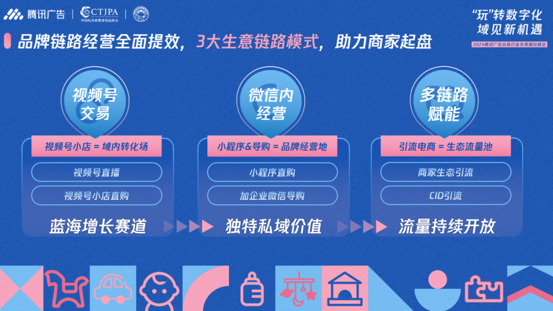 腾讯广告玩具行业运营负责人易思思分享了潮玩品牌在腾讯平台上三种主要的生意模式: