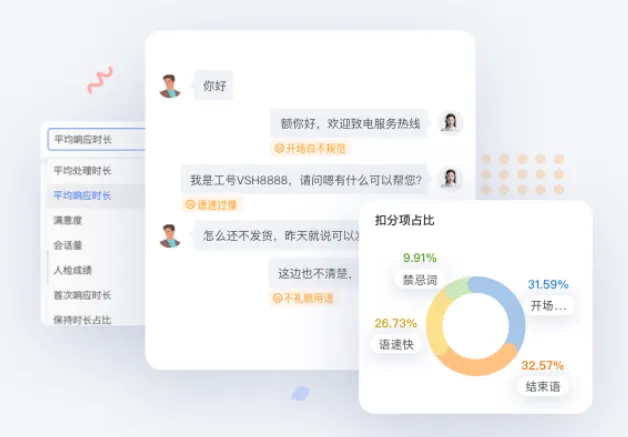 在服务管理方面,智能质检能够对全量客服会话进行监控和分析。基于SOP流程、情绪分析、超时响应、语速快慢、规范用语、客户打断等维度,对坐席在服务过程中遇到的问题进行自动质检。如遇争吵、客诉、事件升级等情形,系统将实时预警管理员,以便第一时间响应客户需求,减少服务风险,进行贴心的服务引导。