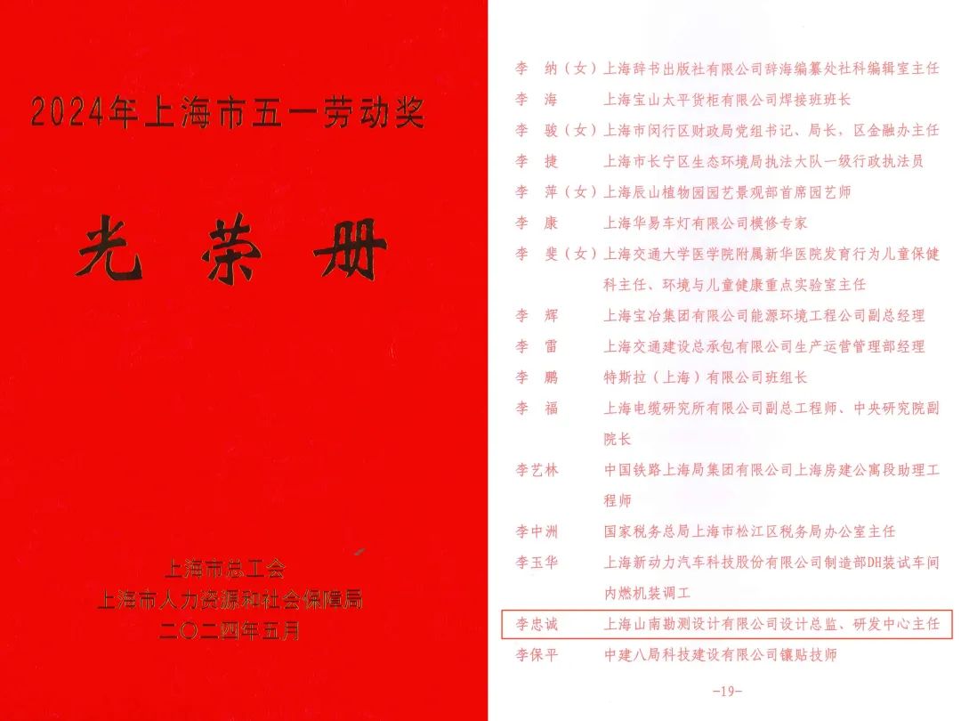 5月13日,由上海市总工会组织的2024年上海市五一劳动奖表彰会暨先进事迹报告会在上海展览中心友谊会堂召开,市委常委、组织部部长张为,市人大常委会副主任、党组副书记、市总工会主席郑钢淼,市政协副主席吴信宝,市委副秘书长燕爽,市政府副秘书长赵祝平,市人社局党组书记、局长杨佳瑛,市总工会党组书记、副主席沈军等出席会议并为获奖者代表颁奖。各区局(产业)工会主席、全国五一劳动奖和全国工人先锋号获奖对象、上海市五一劳动奖获奖代表、工会干部代表等参加会议。山南勘测公司设计总监、研发中心主任李忠诚博士参会并荣获“2024年上海市五一劳动奖章”。