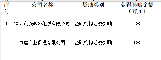 根据《深圳市支持金融企业发展的若干措施》(深金监规〔2022〕2号)、《<深圳市支持金融企业发展的若干措施>资助项目申报操作指引》(深金监发〔2022〕36号)的相关规定,经审核,拟对深圳京能融资租赁有限公司、中建商业保理有限公司共2家机构发放金融发展专项资金补助(见附件),现予以公示,公示期为5月15日至5月22日。任何单位和个人对公示项目有异议的,可在公示期内来电来函实名反映相关情况。