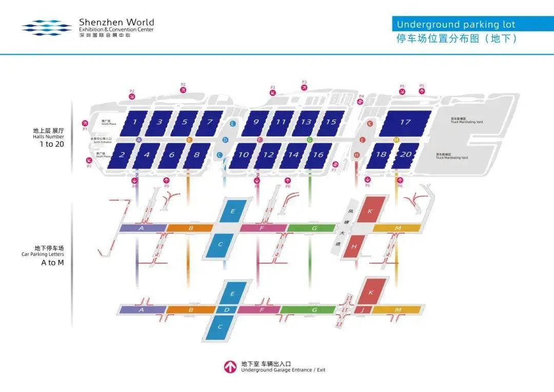 深圳国际会展中心位于地铁12、20号线国展站,由C1、C2口出来后步行至南登录大厅进入。