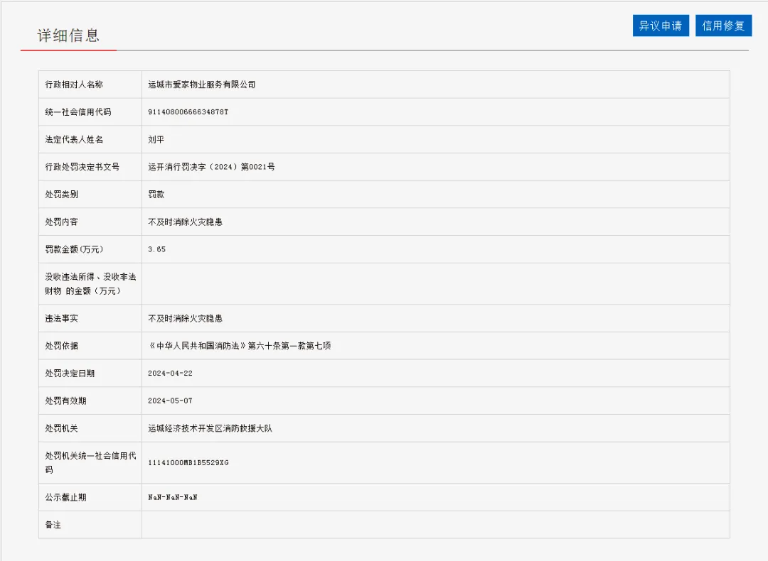 行政相对人名称:运城市爱家物业服务有限公司