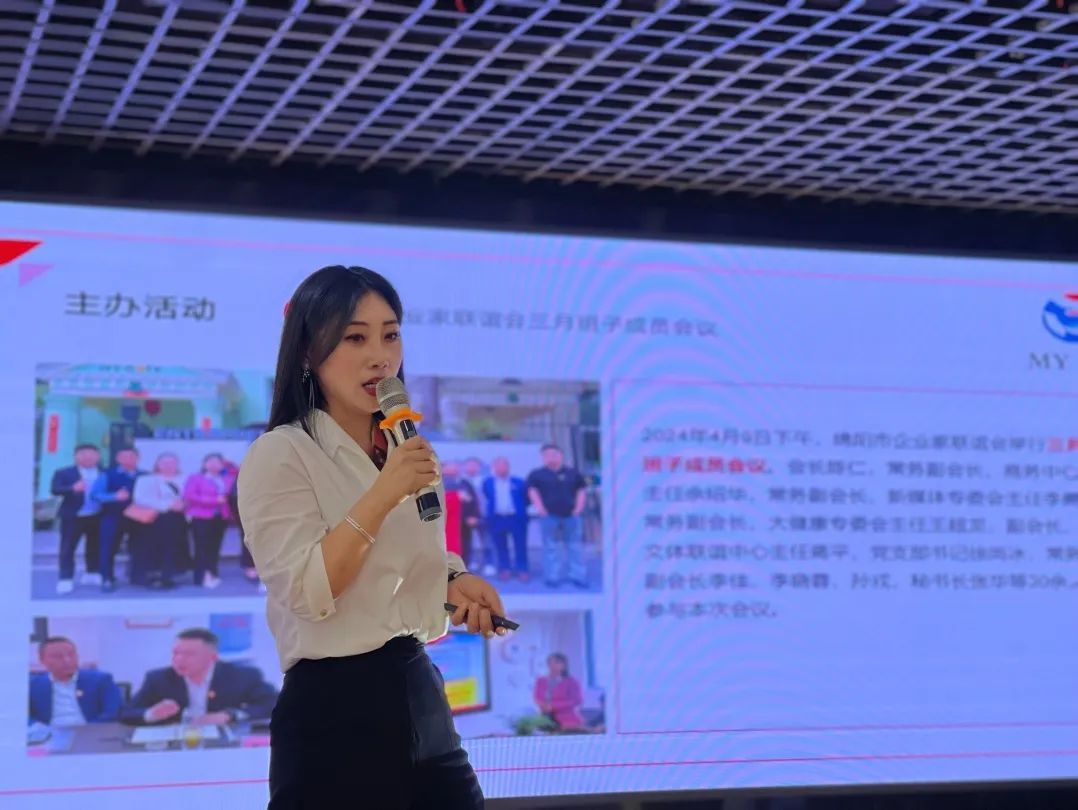张华秘书长作四月工作报告。企业家联谊会始终坚持“立足绵阳,联谊全川、联谊全国、联谊全球”的工作思路,四月,商会主办活动15场,参与活动3场,新增会员单位30家,会员服务280余项,公众号推文发布22篇,阅读量8869,为32家企业做推文、视频和资源群宣传;商会直播28场,宣传企业200家,连麦企业80家,对接意向项目7家;各中心、专委会分别开展活动,其中,商务中心举办线下资源对接会2场,现场促成交易260余笔,效果显著。
