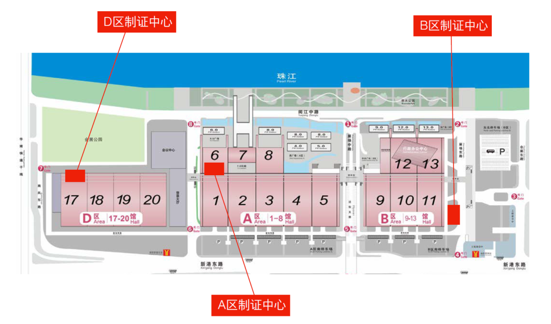 ◆ A 区地点:珠江散步道 6.1 号馆外 6-1、6-2 柜台。◆ B 区地点:地铁琶洲站 A 出口,展场东路制证点(即广交会境外采购商报到处)。