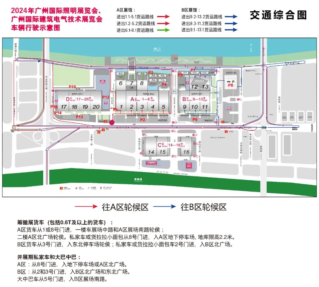 从 1 或 8 号门进,一楼车展场中路和 A 区展场南路轮侯;二楼 A 区北广场轮侯。私家车或货拉拉小面包从 8 号门进,入 A 区地下停车场。