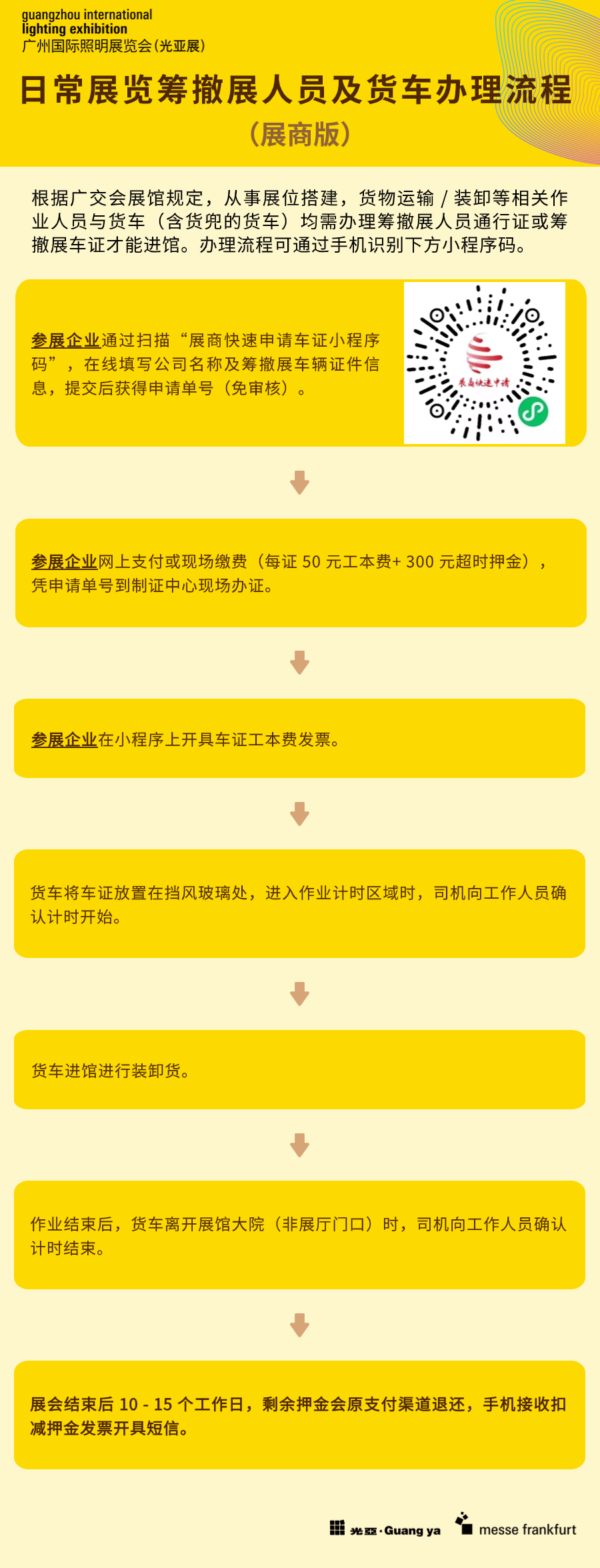 1、使用对象:在展览筹撒展期间需进馆从事展位装搭、货物运输 / 装卸、设备安装等人员均需办理通行证。2、收费标准:每证收费 40 元(赠送人身意外保险费 10 元)。3、证件有效期:通行证在证件载明的展览筹、撤展期间有效,不需重复办证。分期举办的展览,每期需办理证件。1、使用对象:在展览筹撤展期间运送装搭材料、展品和设备等进出展馆的货运车辆。2、收费标准:每车每证 50 元,押金 300 元。3、证件有效期与押金清退:车辆在车证有效期内每经过入口和出口验证计时点一次视为一个有效期(一个车证仅能一个馆一次进出),当次进馆免费停留时间 150 分钟。超时收费,从押金中扣除(每超过半小时扣 50 元,余额原路退还,扣完为止。)