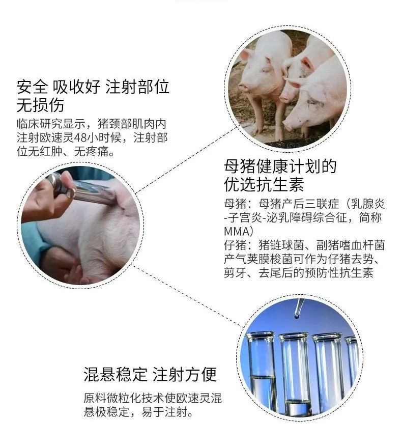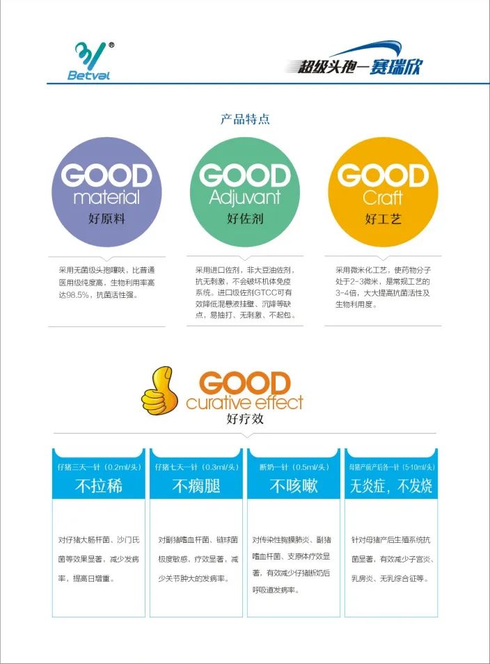 微米晶型头孢原料,进口佐剂、GTCC等,易抽打、无刺激、不起包,药效持续168小时,给母猪和仔猪更好保护。