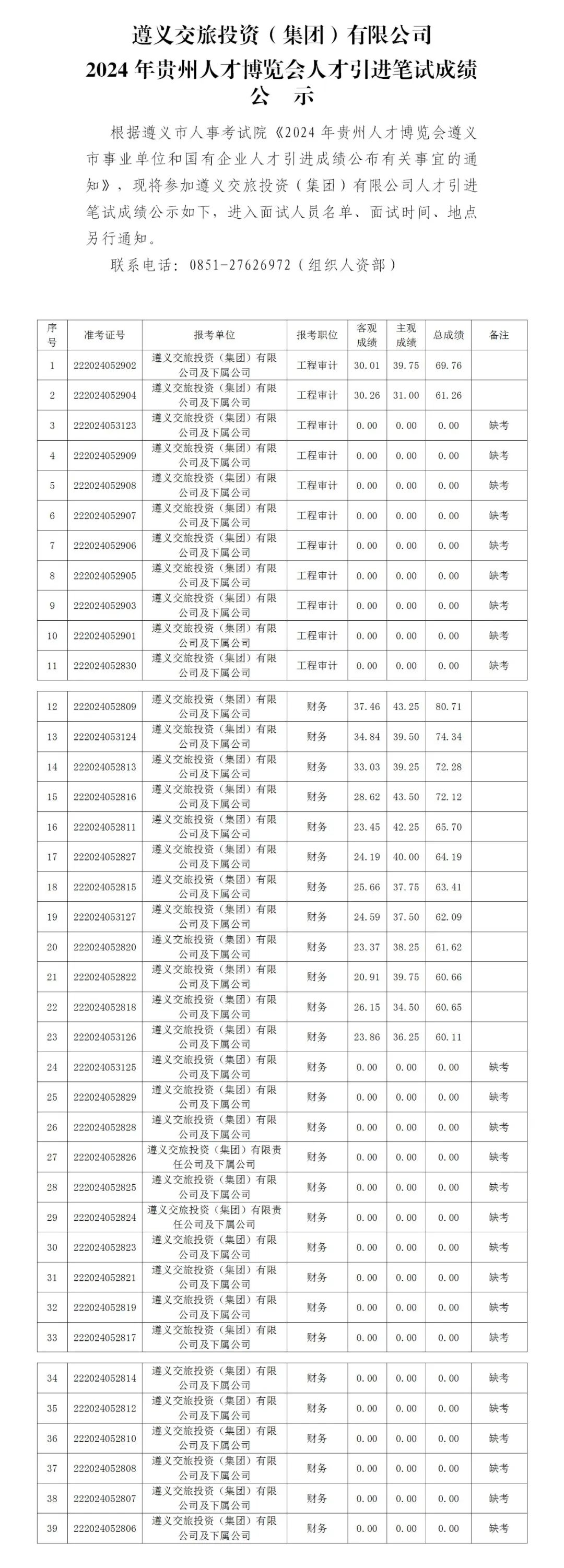 遵义交旅投集团2024年贵州人才博览会人才引进笔试成绩公示