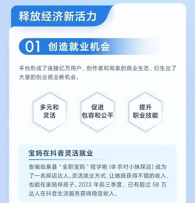 5月13日消息,《2023抖音集团企业社会责任报告》今天正式发布。报告数据显示,在创造就业机会方面,2023年前三季度,已有超过58万达人在抖音生活服务获得稳定收入。