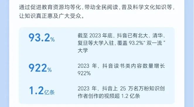 截至2023年底,抖音已有北大、清华复旦等大学入驻,覆盖93.2%“双一流大学。2023年,抖音读书类内容数量增长922%。2023年,抖音上25万名万粉知识创作者创作的视频超1.2亿条。