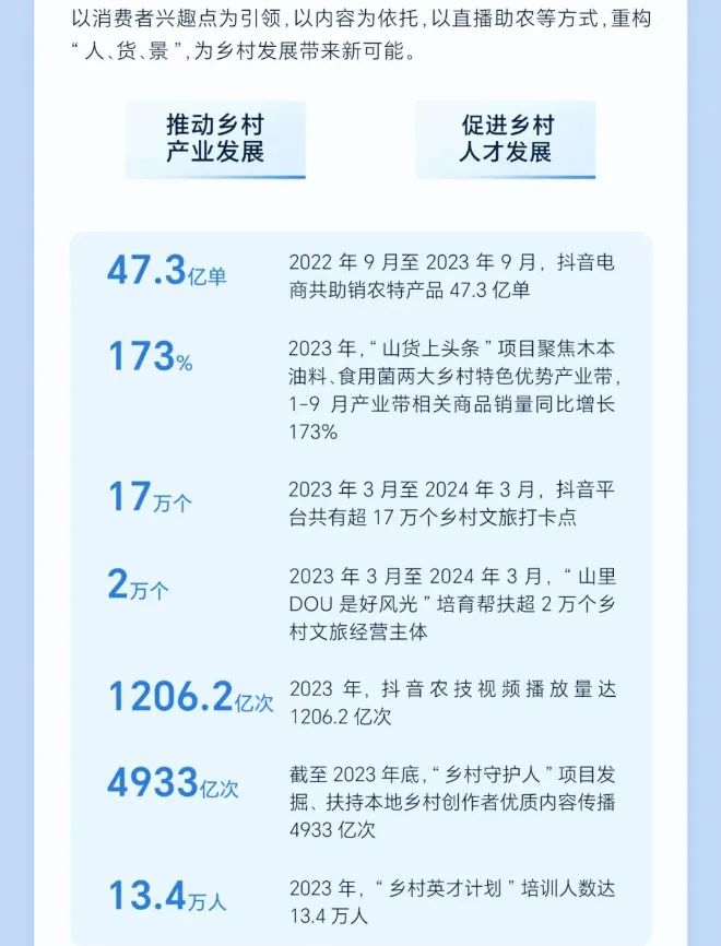 2023年3月至2024年3月,抖音平台共有超17万个乡村文旅打卡点。2023年3月至2024年3月,“山里DOU是好风光”培育帮扶超2万个乡村文旅经营主体。2023年,抖音农技视频播放量达1206.2亿次。