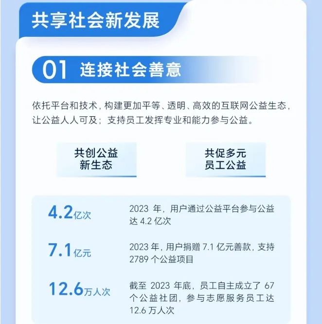 社会公益与公共服务方面,2023年,抖音用户通过公益平台参与公益达4.2亿次。2023年,用户捐赠7.1亿元善款,支持2789个公益项目。截至2023年底,员工自主成立了67个公益社团,参与志愿服务员工达12.6万人次。