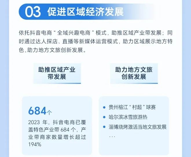 促进区域经济发展方面,2023年,抖音电商已覆盖特色产业带684个,产业带商家数量增长超过194%。