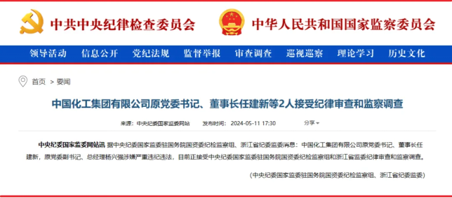 5月11日,中央纪委国家监委通过其官方网站发布消息称,中国化工前党委书记、董事长任建新和前党委副书记、总经理杨兴强因涉嫌重大违纪违法现正接受调查。调查由中央纪委国家监委驻国务院国资委纪检监察组和浙江省监委联合进行。
