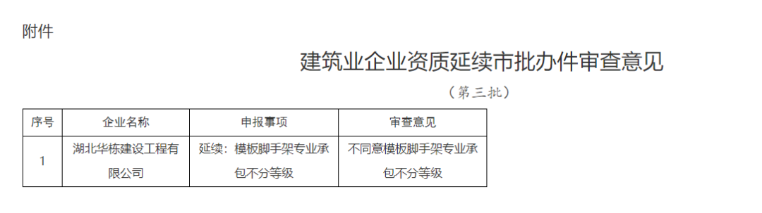 根据省住建厅《关于建设工程企业资质延续有关事项的通知》(厅头〔2023〕2441号)《建筑业企业资质标准》等有关规定,近期我局组织专家对湖北华栋建设工程有限公司申请的建筑业企业资质延续进行了审查,现将审查意见予以公示(见附件)。