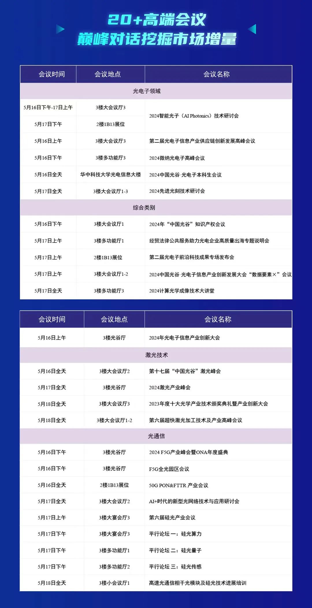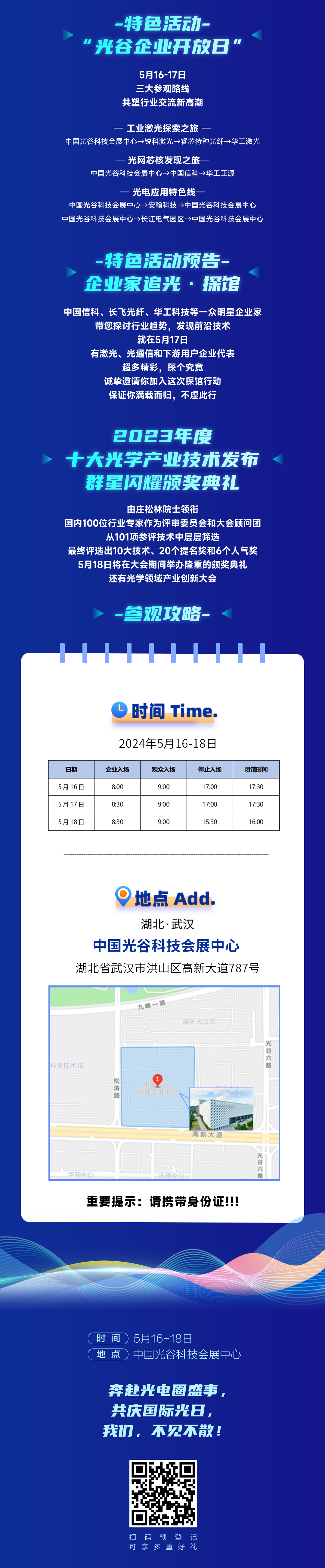 同时,5月17日还设置了“企业家追光·探馆”特色活动,邀请激光、光通信和下游终端客户等知名企业代表,通过“大咖探馆”的形式展示光电领域的创新成果,建立起长效的互动沟通机制,推动全产业链范围的交流与合作。届时,中国信科、长飞光纤、华工科技等一众明星企业家将带大家探讨行业趋势,发现前沿技术。