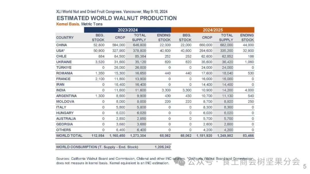 INC数据显示,2023/24产季,全球带壳核桃供应量292.2万吨,期末库存15.8万吨;预计2024/25产季,全球带壳核桃产量270.8万吨。