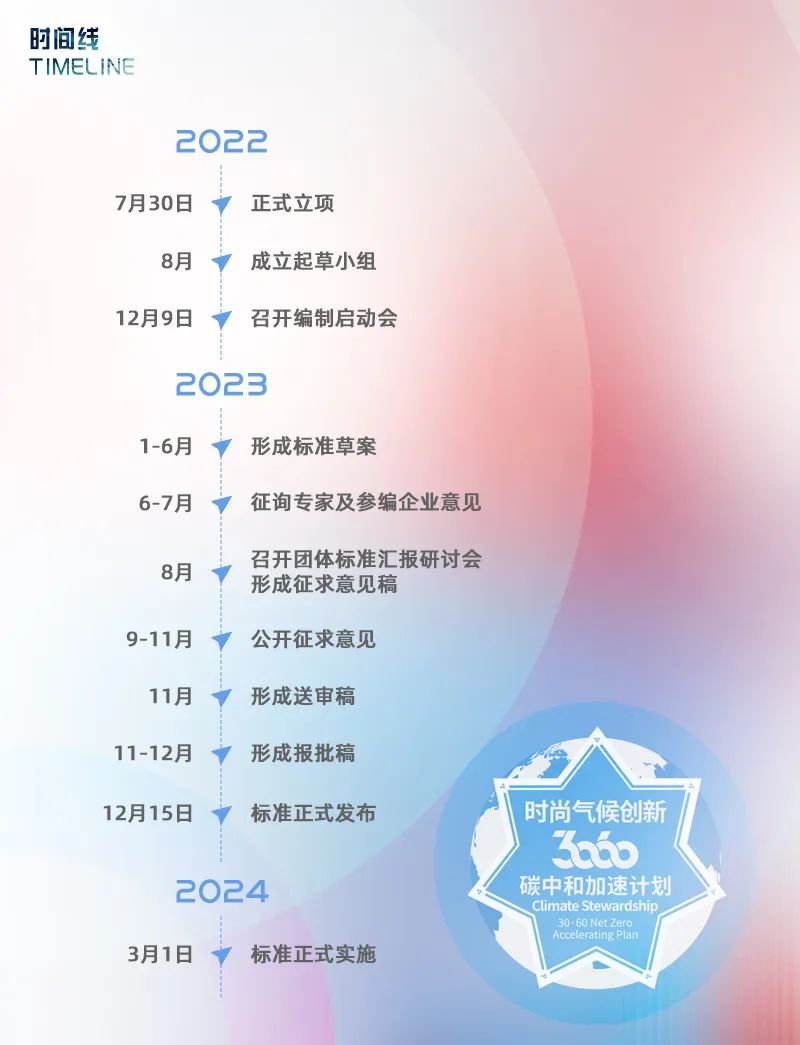依照工信部《工业领域碳达峰实施方案》,三项团体标准由中国纺织工业联合会提出,由中国纺织工业联合会标准化技术委员会归口。标准自2022年7月起立项,共历经20个月于2023年12月15日完成起草工作和审批,2024年3月实施。在中国纺织工业联合会社会责任办公室的组织下,总计22家“时尚品牌30·60碳中和加速计划”行动企业和9个分行业组织分别参与到标准起草工作,起草小组在过程中进行了多轮研究讨论及专家咨询,对重大问题进行审慎研究,最终达成共识形成标准发布稿。