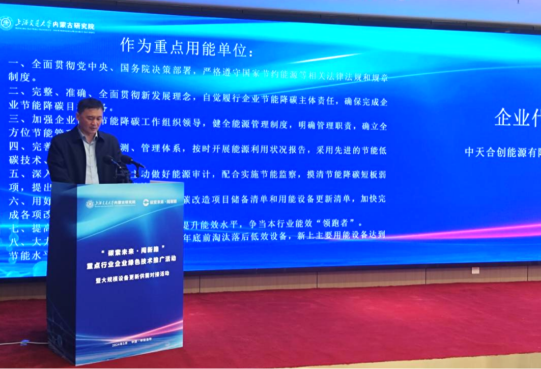 5月14日上午,自治区发改委组织开展“全国节能周”活动暨大规模设备更新供需对接会,中天合创化工分公司副总经理易智代表全区重点用能企业发表节能倡议。