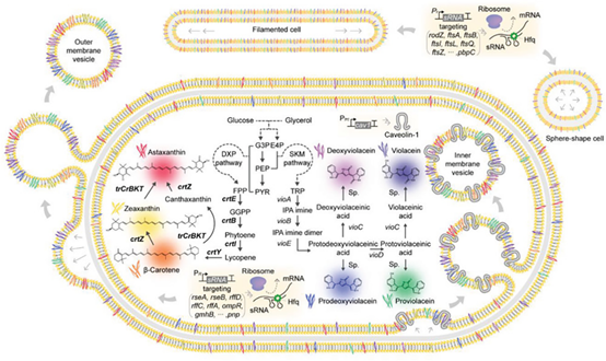 在前沿研究方面,有学者采用代谢工程手段进行微生物色素菌种的构建和代谢途径的调控,通过在大肠杆菌(非产色素菌)中导入微生物色素合成酶基因来改变代谢途径,获得了七彩色素。