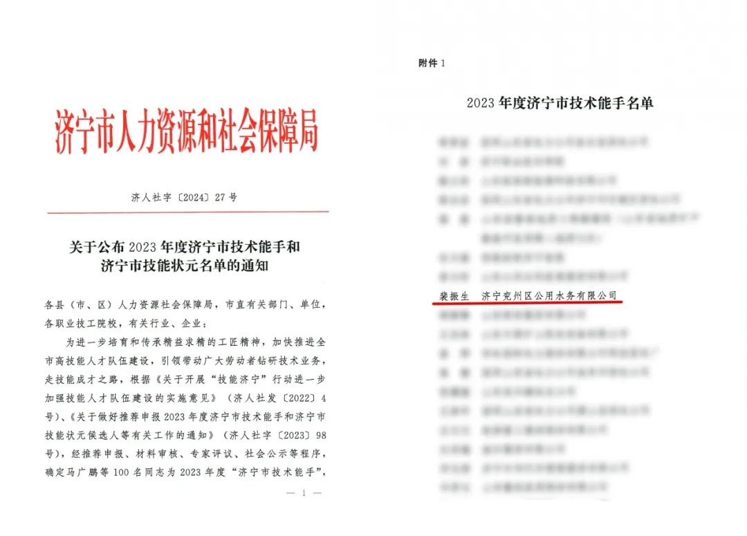 近日,济宁市人力资源和社会保障局发布《关于公布2023年度济宁市技术能手和济宁市技能状元名单的通知》,本次评选根据《关于开展“技能济宁”行动进一步加强技能人才队伍建设的实施意见》等文件精神,经过推荐申报、材料审核、专家评议、社会公示等程序,确定2023年度“济宁市技术能手”。济宁兖州区公用水务有限公司裴振生获得“2023年度济宁市技术能手”荣誉称号。